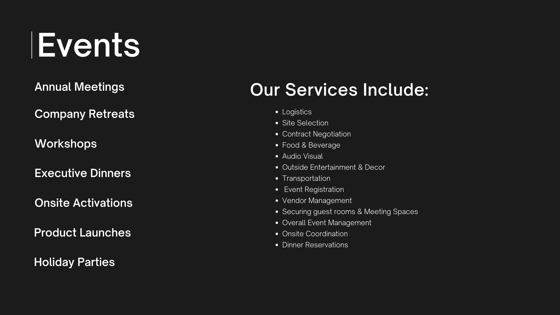 Our mission is to tell your story and meet your objectives through storytelling. An event is a blank canvas to draw your attendees in and create an impression that is long lasting.